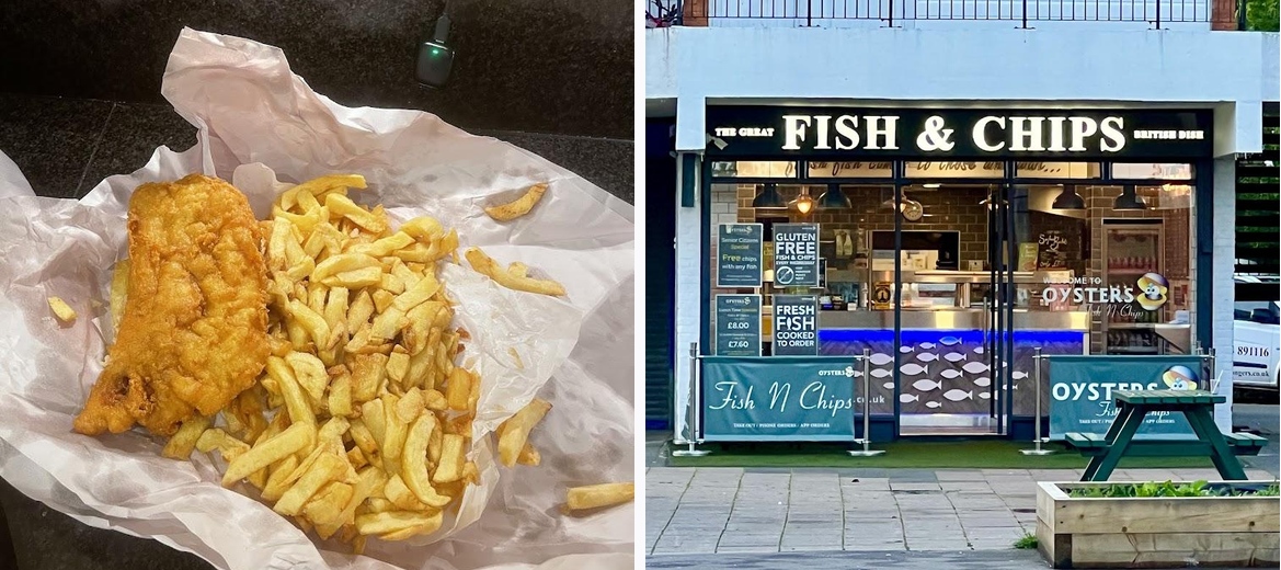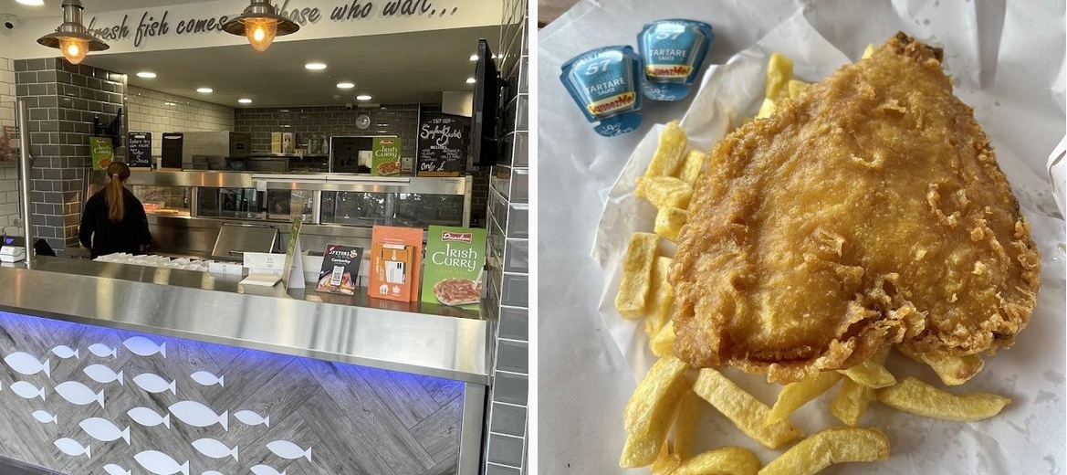 Great fish and chips, recommended. Freshly cooked to order and decent value at £10.70 for good sized portions of cod, chips and mushy peas. Friendly service and food served in paper bags. Very tasty, perfectly cooked cod in a nice light batter. Chips were pretty good but personally I’d have preferred them a little more cooked / crisper. Very clean, new looking shop with some outdoor seating.